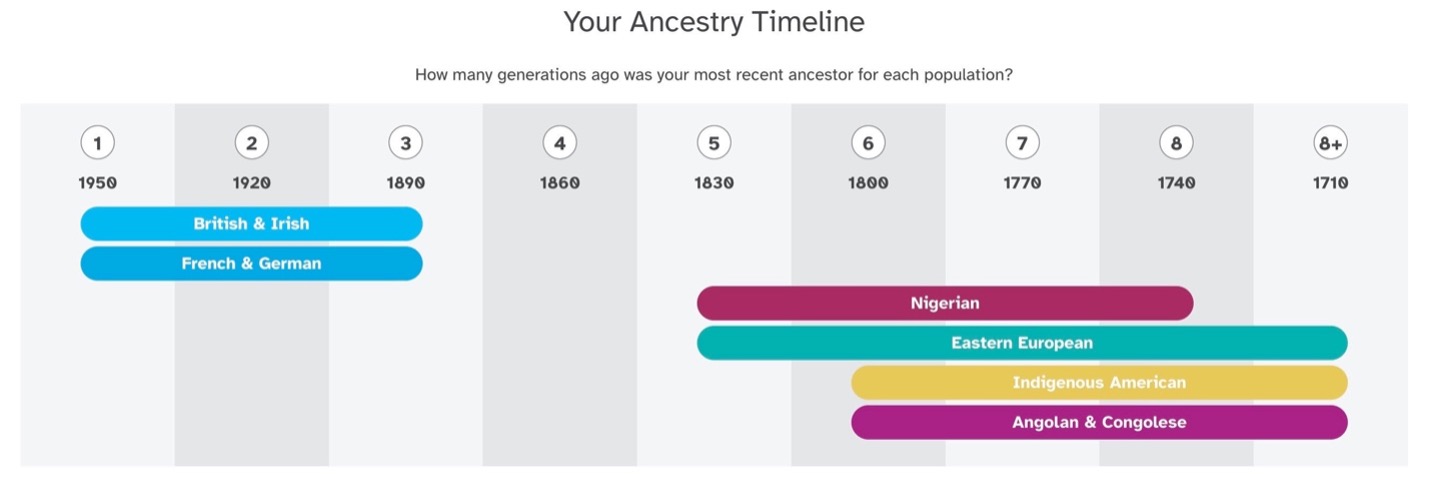 Many Melungeon descendants today are white-passing, yet can find evidence of mixed ancestry in their DNA. The screenshot above, of my 23andMe Ancestry Timeline, is a good example of this. Many of us, who are so far descended from our Melungeon ancestors, may have only trace amounts (1-2% or less) of African and Indigenous ancestry in our DNA results.* However, by using a variety of the available ancestry tools, we can gain more insight. Again, there isn’t a test that can tell you for sure if you’re Melungeon; It’s the specific admixture results you’ll see on reports that provide the most help in this area.