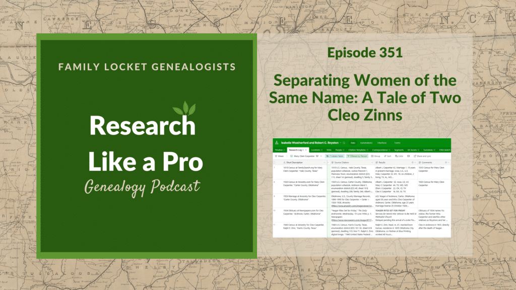 In this episode of Research Like a Pro, Diana and Nicole discuss the challenge of separating women with the same name in genealogical research, specifically focusing on two women named Cleo Zinn. Diana