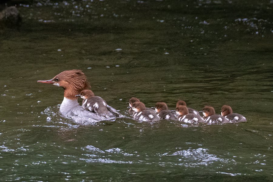 Elegant, streamlined Common Mergansers gather on the freshwaters of the Blue Ridge during winter.