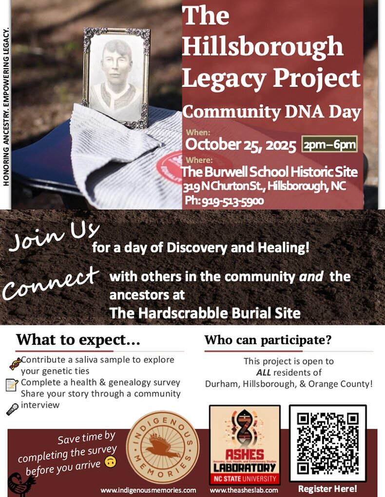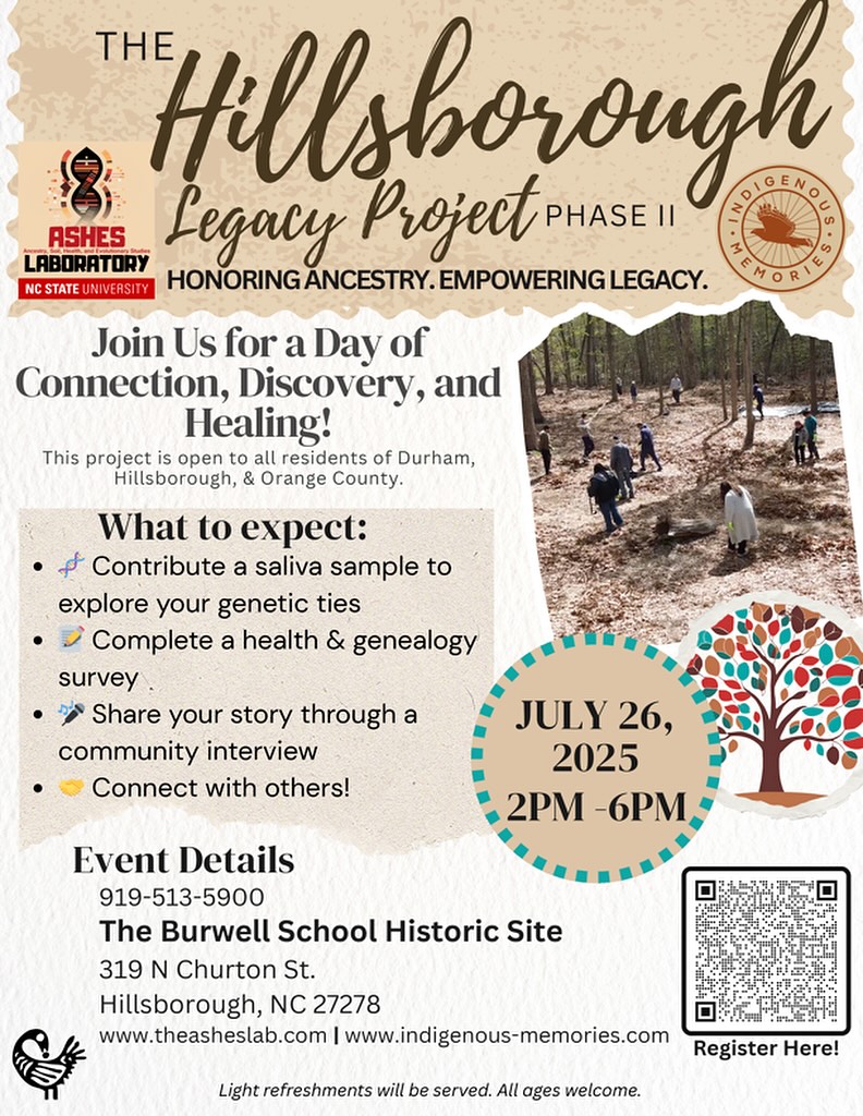 Join @indigenous.memories and @ashes_lab for The Hillsborough Legacy Project – Phase II on Saturday, July 26 from 2–6 PM at the Burwell School Historic Site! Come explore your ancestry, share your story, and